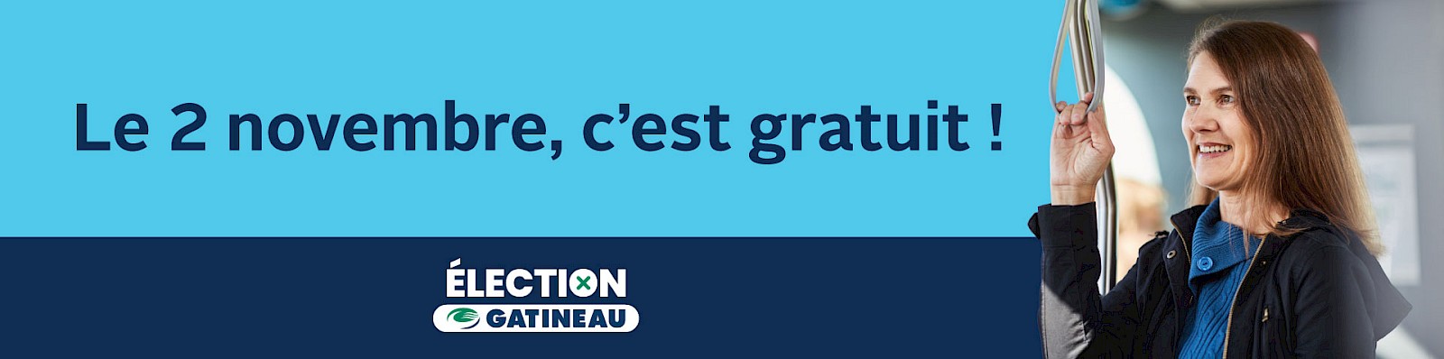Cette gratuité au niveau du transport en commun sera offerte à l’ensemble des citoyens de Gatineau. Elle vise à faciliter les déplacements vers les différents bureaux de vote sur le territoire de la Ville de Gatineau et sera en vigueur toute la journée du dimanche 2 novembre.